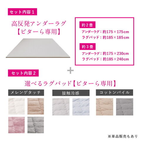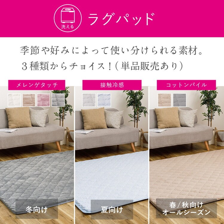 ラグパッドは「メレンゲタッチ」「接触冷感」「(コットン)パイル」の3種類の生地タイプからお選びいただけます。