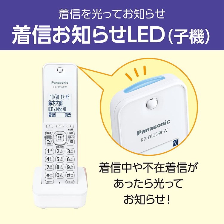 ●2光って分かりやすい「着信お知らせLED」を子機に搭載。着信中に光ってお知らせするLEDを子機に搭載。不在着信や留守録があったときにも、ゆっくり点滅して着信があったことをお知らせします。