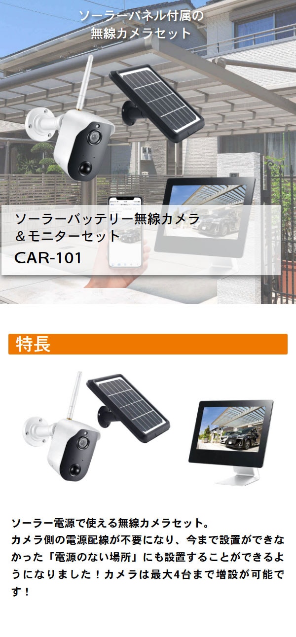 防犯カメラ ワイヤレス 無線 屋外 防犯カメラセット モニター付き 家庭用 簡単 設置 高画質 200万画素 録画機能付き ソーラーバッテリー無線カメラ&モニターセット CAR-101 キャロットシステムズ【ポイント10倍】 【送料無料】