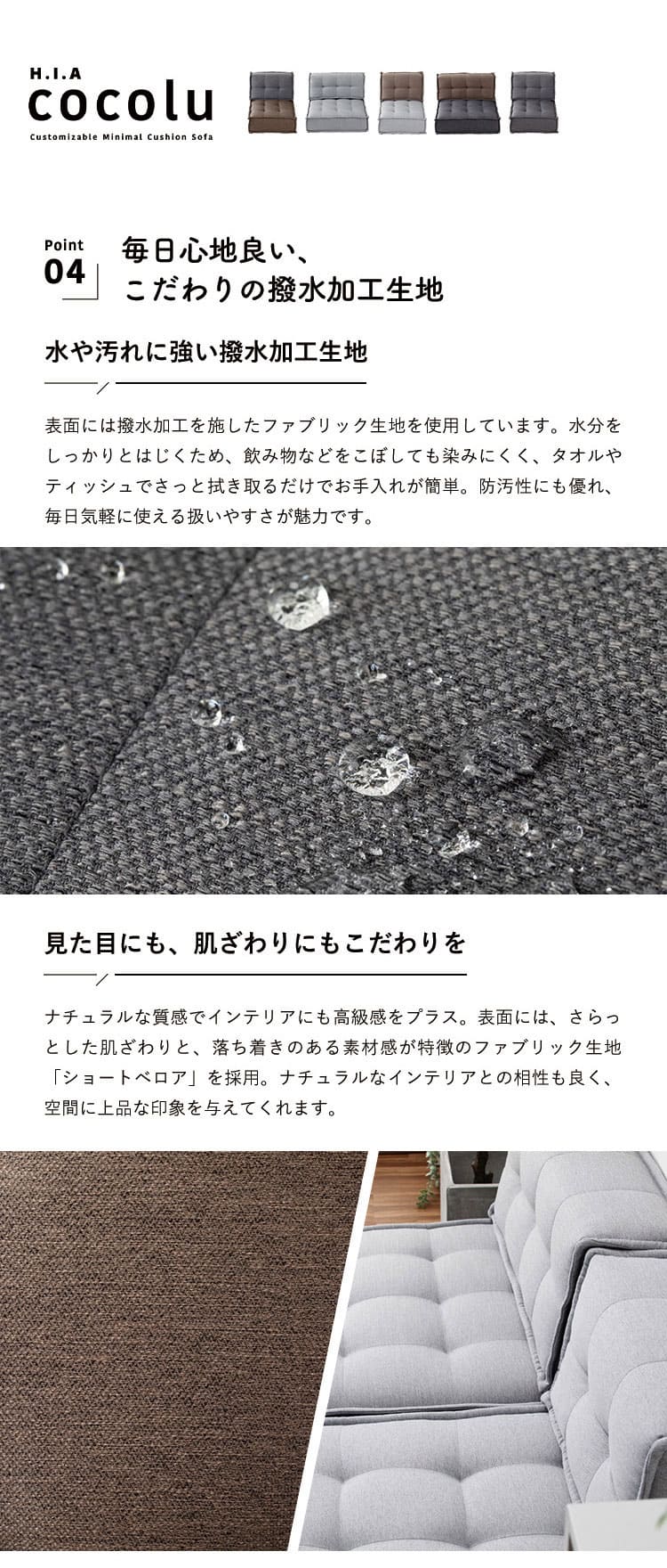 自由にカスタマイズできるクッションソファシリーズ。色と形を選んで自分だけのクッションソファを作ってみませんか?座面、背もたれを自由に組み合わせることでお部屋にちょうどいい形や大きさにすることができます。撥水加工が施された生地を使用しているため水こぼしや汚れに強い商品となっています。座面内部にはポケットコイルを使用しているので体圧を分散しやすく、体にフィットしやすいという特徴があります。裏面に滑り止め加工を行っているため、使用中ずれにくくなっております。