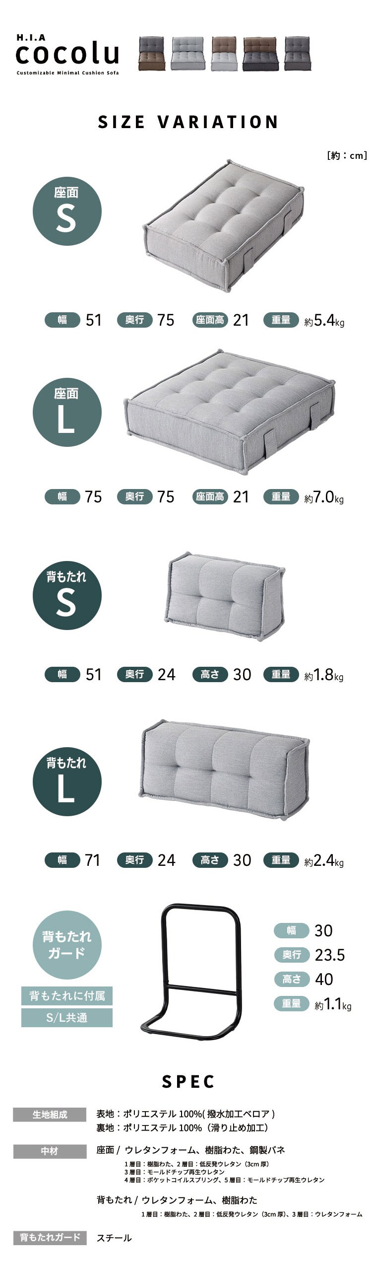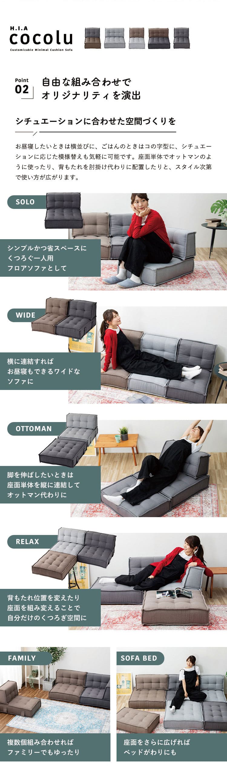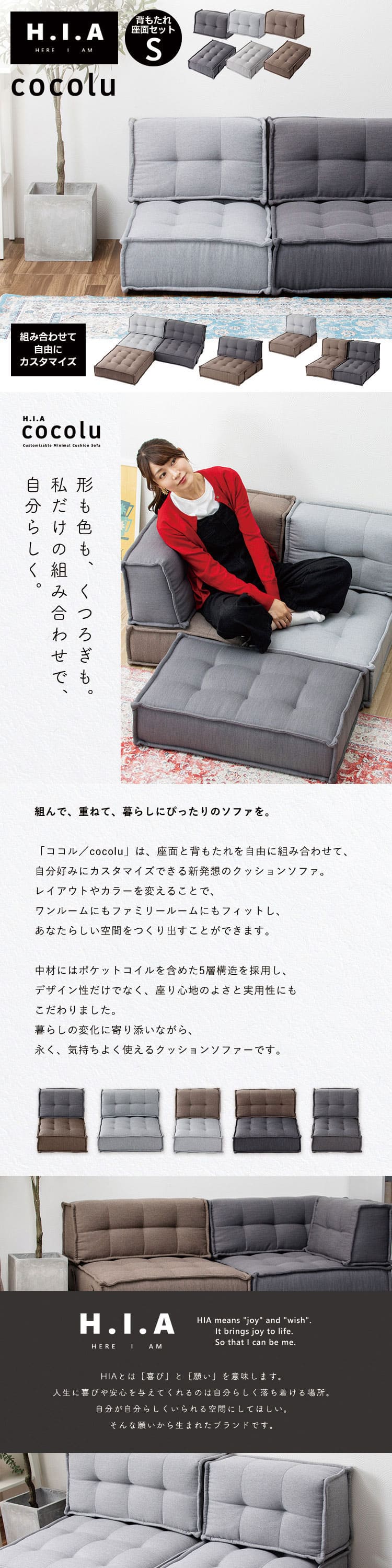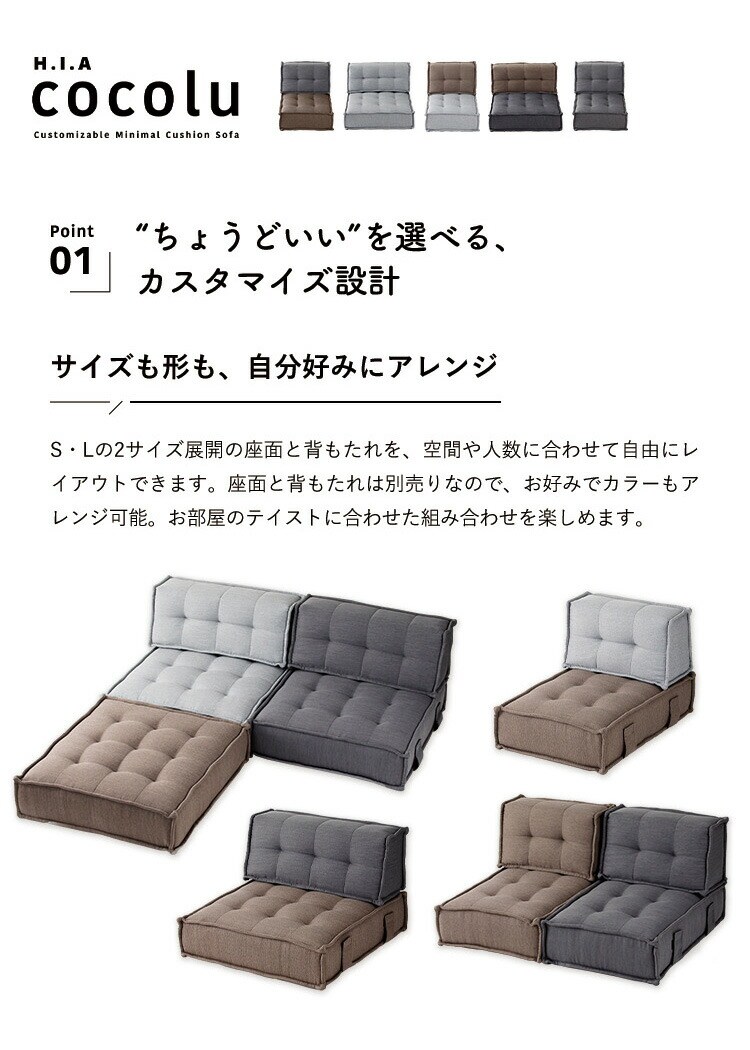 HIA カスタマイズできるミニマルクッションソファ- Sサイズ 座面+背面 セット フロアクッション フロアソファー 組み合わせ自由 コンパクト 低反発 ローソファー ソファ ポケットコイル【送料無料】