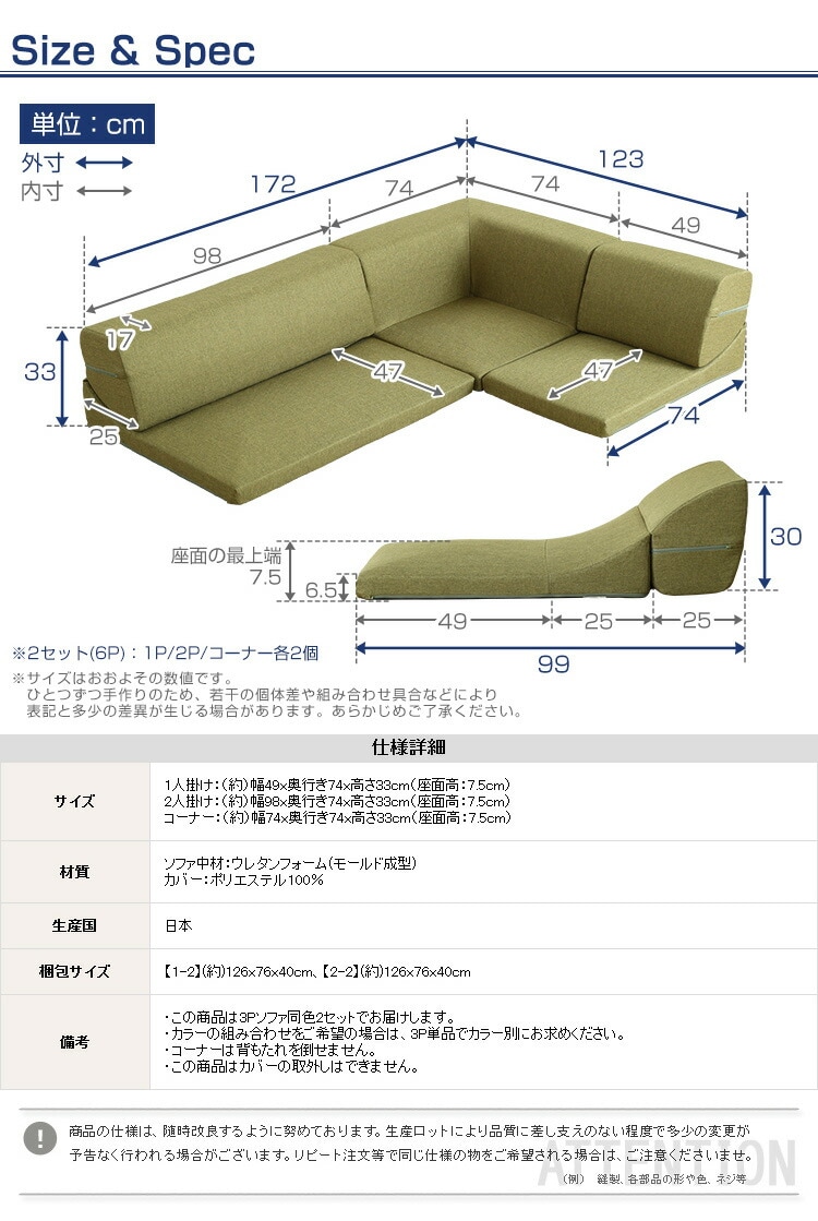 コーナー:(約)幅74x奥行き74x高さ33cm(座面高:7.5cm)