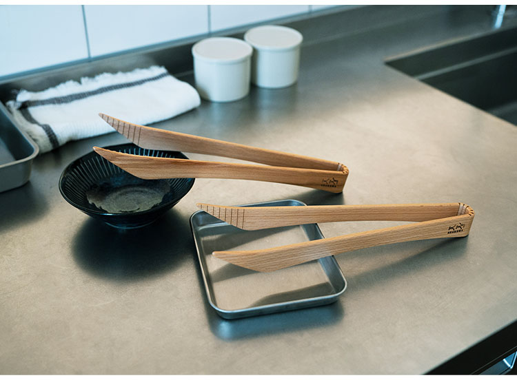 〇曲木技術の一つ「挽き曲げ」により、一枚板から作り出された木製トング。