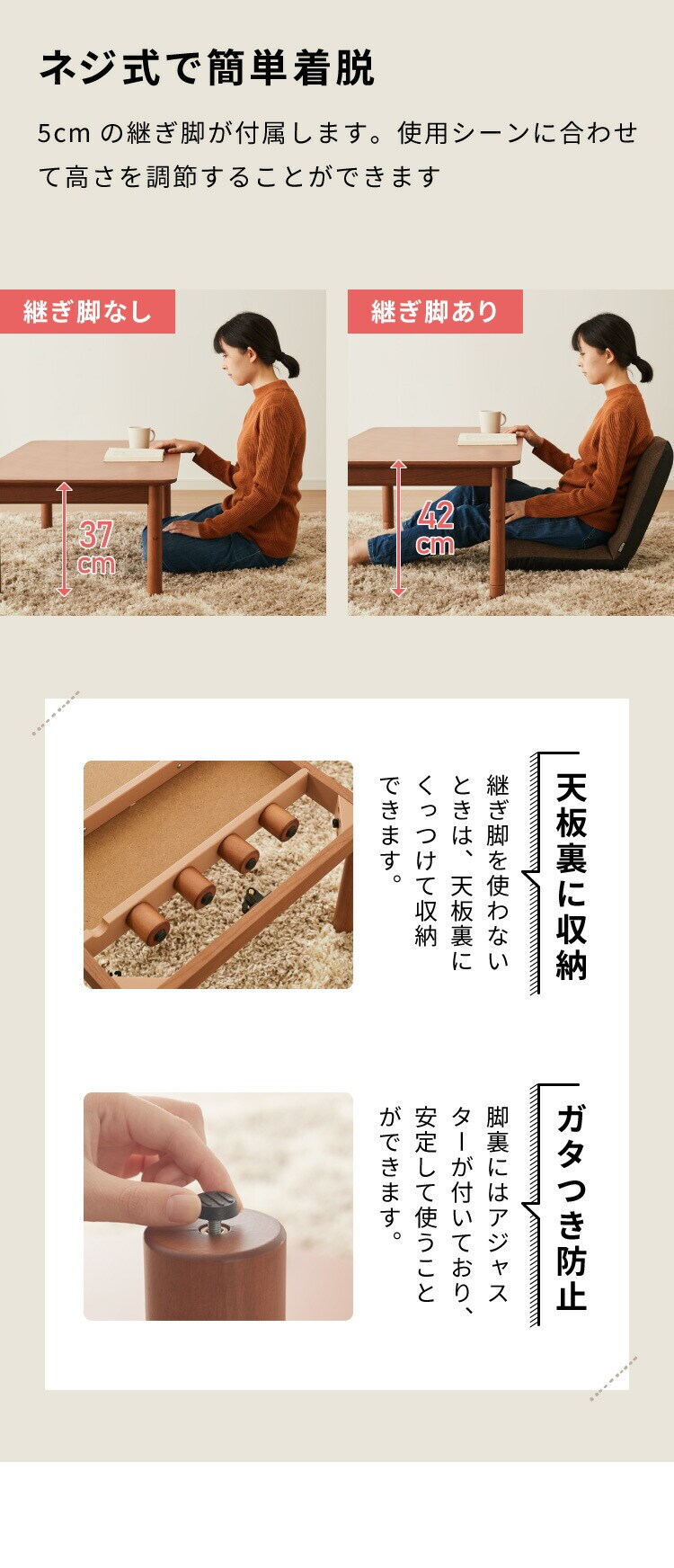 継脚機能付きなので、座卓やクッション、座椅子など使用シーンに併せて活躍します。
