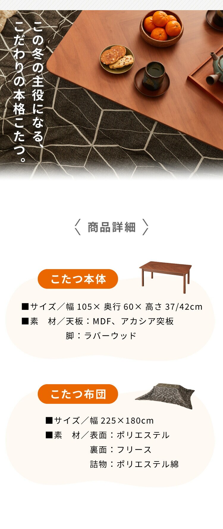 本体(ラバーウッド)、天板(MDF、アカシア突板)、布団(ポリエステル、裏面フリース、詰物ポリエステル綿)