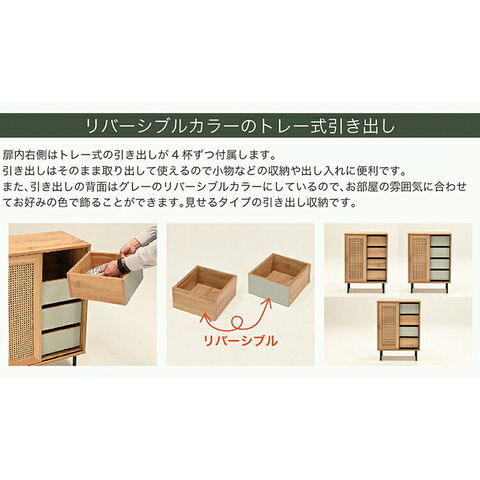 引き出しは表面と裏面でリバーシブルとなり、ウッドテイストを前面に押し出したスタイルとグレージュのアクセントを取り入れたスタイルとコーディネート出来ます。