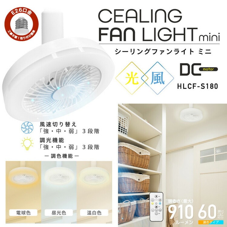 シーリングファンライト ファンとライトが一つに ライト ミニ 3段階調色機能 3段階調光機能 3段階風速調節 角度調節 リモコン 工事不要 HLCF-S180【送料無料】