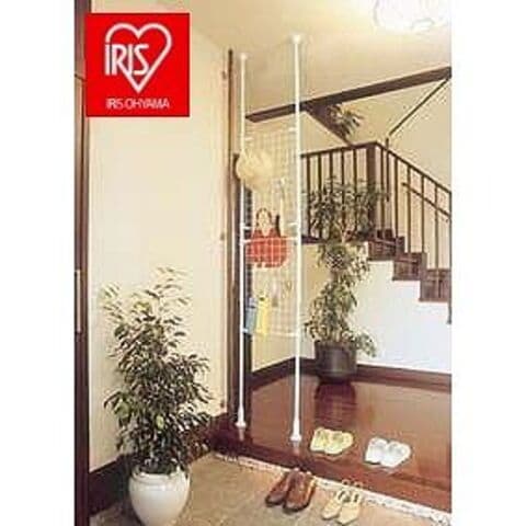 天井にポールを突っ張らせることで、部屋の仕切りや小物を掛けるのに使用できる伸縮間仕切りです。メッシュパネルをポールの内側に取り付けていますので、デザイン的にもすっきりし、小物をパネルの両面に掛けやすくなっています。帽子や時計、その他小物などが掛けられるフックが4個付いています。