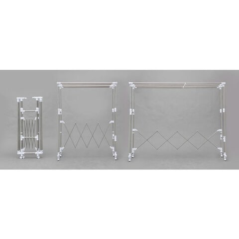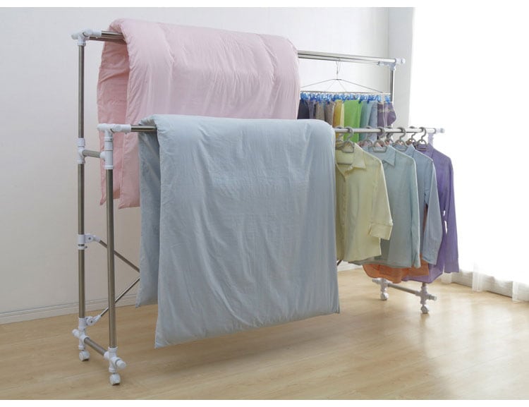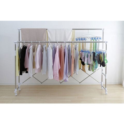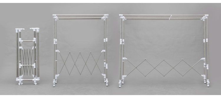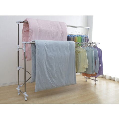使用用途に合わせて幅・高さが伸縮できる物干しです。最大210cmまで広がり、ふとんを4枚干すことができ、使用しない時はたたんでコンパクトに収納することができます。片側のサイドバーが低い位置にあり、ふとんを横からスライドさせて干すことができる設計と、エアコンの風も通りやすい幅をしっかりと取った風通しの良い構造です。