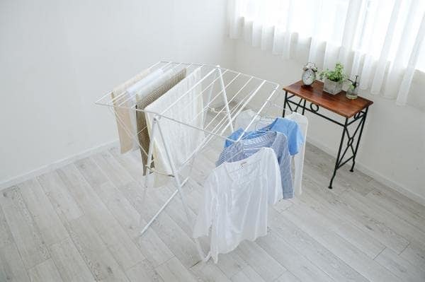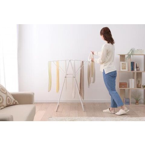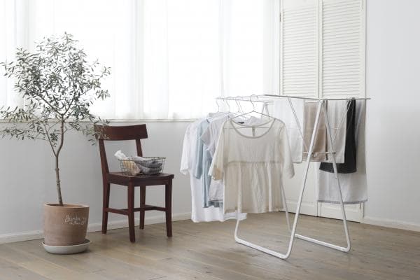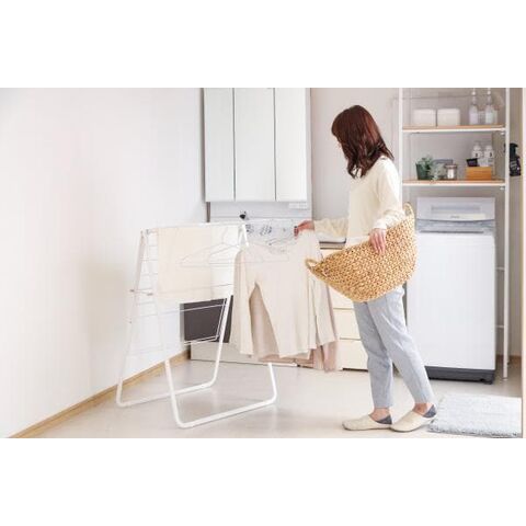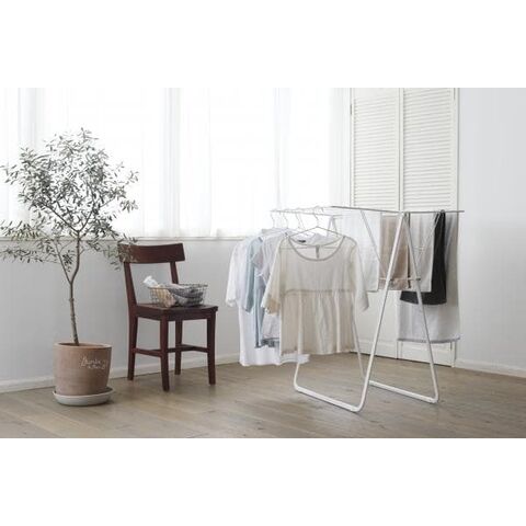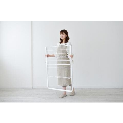 マットな質感のスチールパイプで、お部屋に置いても圧迫感のないシンプルなデザインの室内物干しです。衣類やタオルのほか、大判サイズのバスタオル、まくらやセーターなどの平干しもできます。支え位置を変更するとハンガー部の高さを調整することができます。使用しないときは折りたたんで、コンパクトに収納が可能です。簡単に組み立てができます。