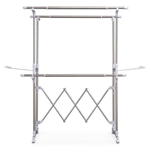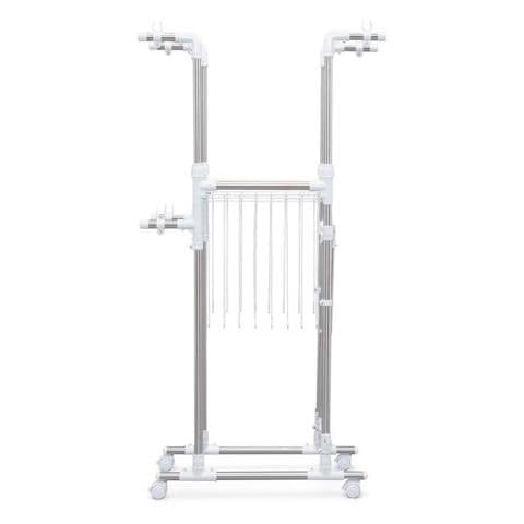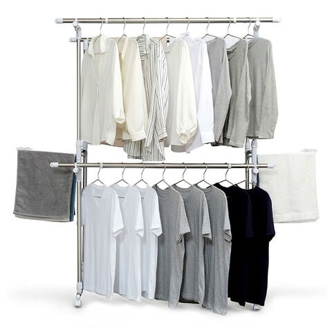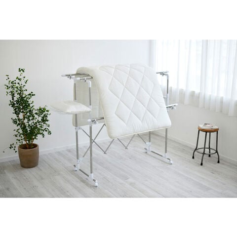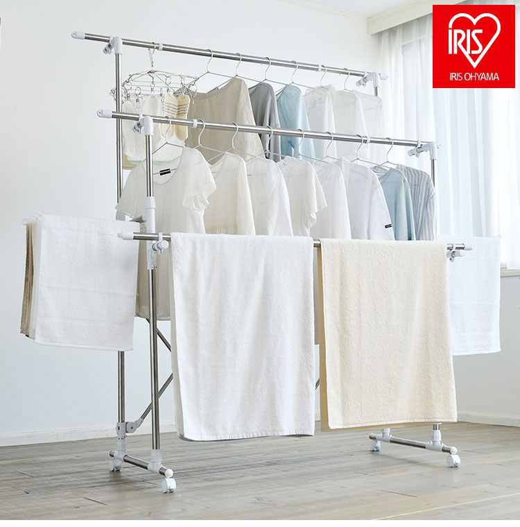 干す量やスペースに合わせて、幅も高さも調節可能な大型伸縮タイプの物干しです。段違いに干せるので、風通しが抜群で効率よく乾きます。大容量の洗濯物を干すことができ、ワンピースやズボンなどの長物も干せます。安定した脚部で前倒れしにくい設計です。タオルハンガー付きです。移動に便利なキャスター付きで、使用しないときは折りたたんでコンパクトに収納できます。