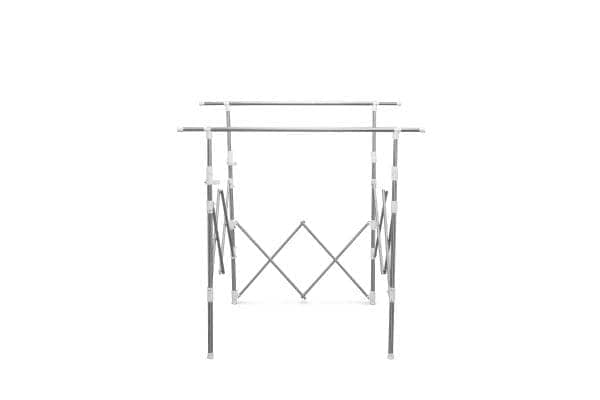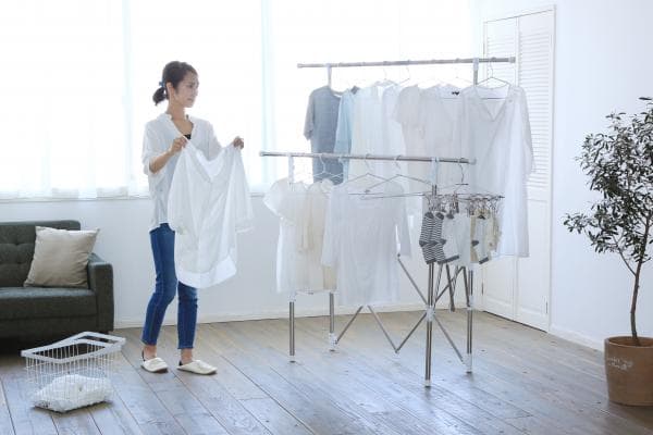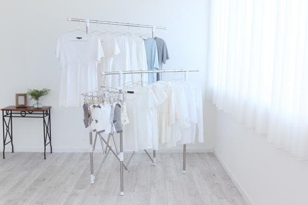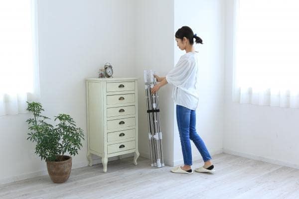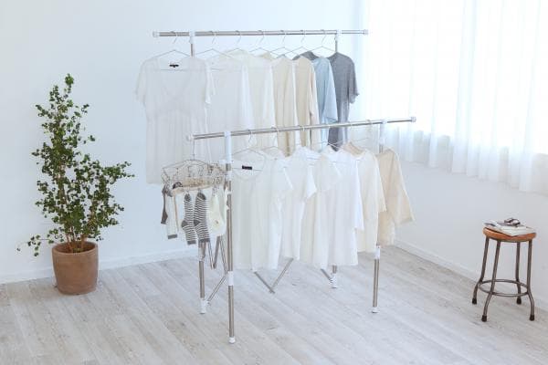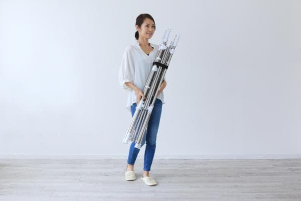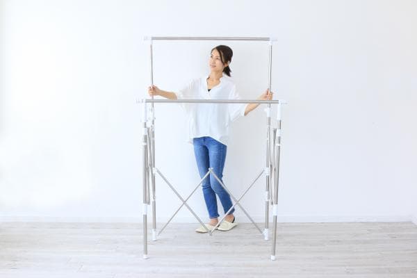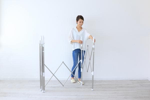 干す量やスペースに合わせて伸縮できる組み立て不要の物干しです。使用しない時は、スリムに収納できる収束タイプです。収納や持ち運びに便利なゴムバンド付きです。スリムにまとまるので、1階から2階やベランダから室内への移動など、女性でも持ち運びしやすくなっています。ワンピースやズボンなどの長物も干せます。ステンレス巻きスチールパイプを採用しているので、丈夫でサビに強く長くお使いいただけます。