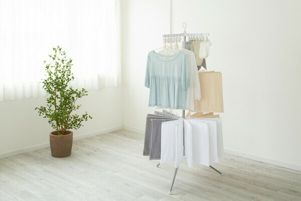 省スペースでもしっかり干せるステンレス室内物干しパラソル3段タイプです。小物だけを干したいときは取り外してピンチハンガーとしても使用可能です。最上段のピンチハンガーバーにはハンガーにかけた衣類も干せて便利です。洗濯物の長さに合わせてタオルハンガーの高さを自由に調節できます。使用しないときは、折りたたんでコンパクトに収納できます。ステンレス巻きスチールパイプを採用しているので、丈夫でサビに強く長くお使いいただけます。工具不要で、組み立てが簡単です。