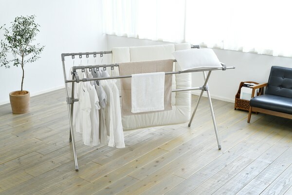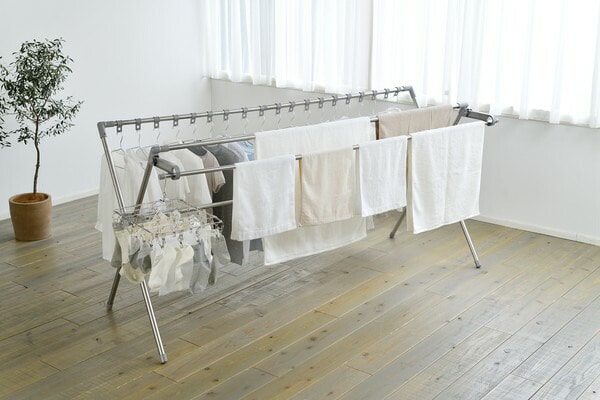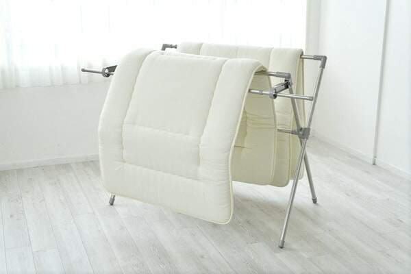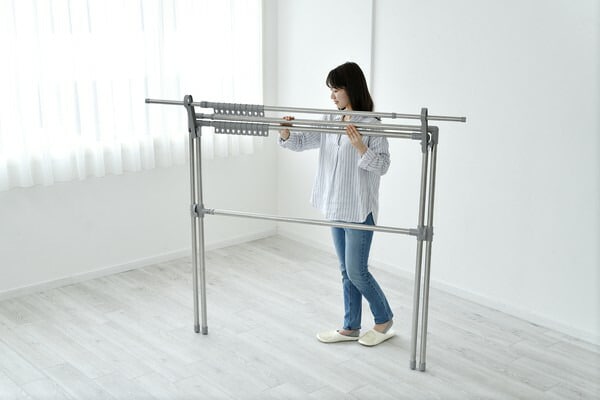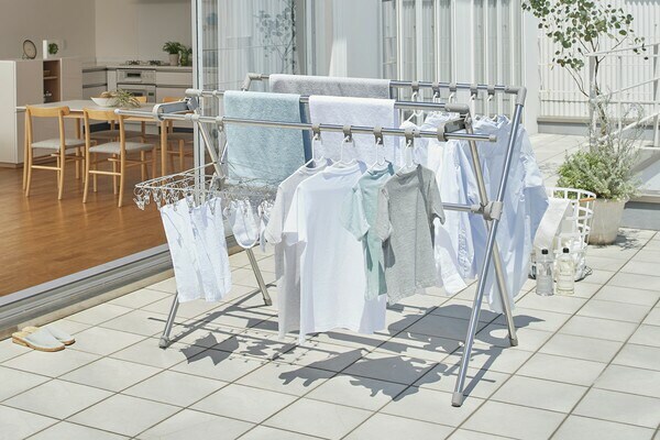布団の枚数に合わせて、伸縮できる大容量タイプのふとん干しです。ダブルバーで、空間ができるため風通しがアップします。衣類が片寄らない、ハンガー固定パーツ付きです。使用しないときは、折りたたんで収納できます。ステンレス巻きスチールパイプを採用しているので、丈夫でサビに強く長くお使いいただけます。工具不要で、組み立てが簡単です。