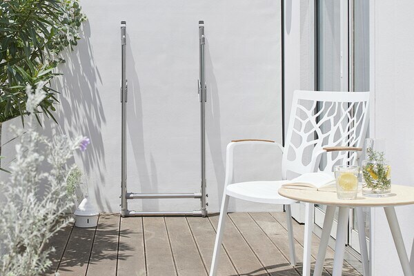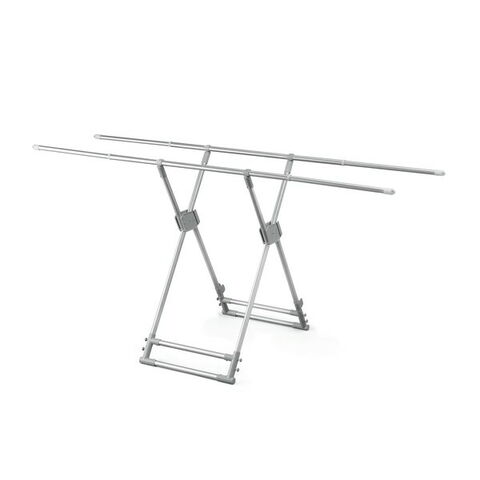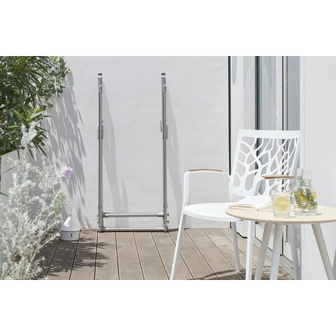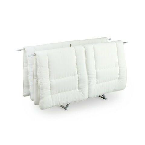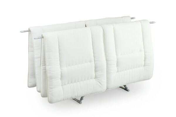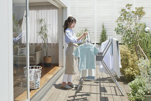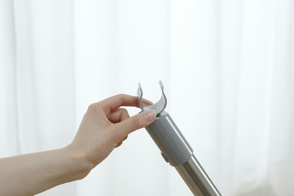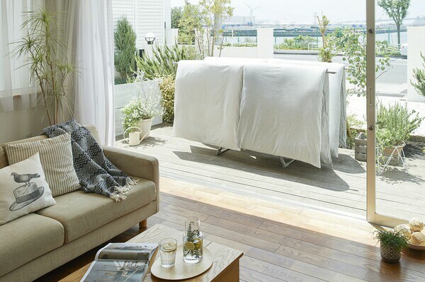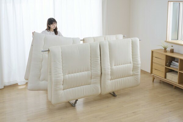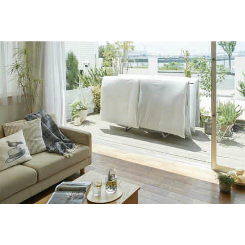 限られたスペースでも十分に干せるふとん干しです。使用しないときは、折りたたんでコンパクトに収納できます。横からスライドしてふとんをかけられるので、簡単に干せます。また掛けやすいように、干すものに合わせて形を変えることができます。先端のパーツを回して竿の向きを変えます。工具不要で、組み立てが簡単です。
