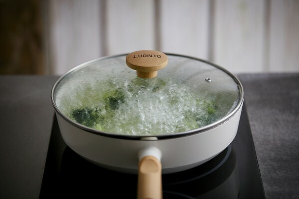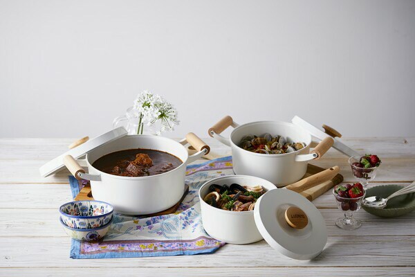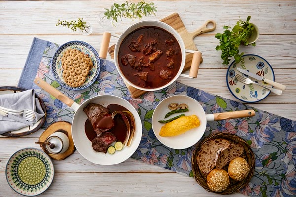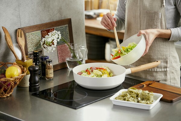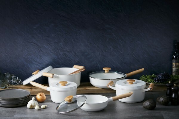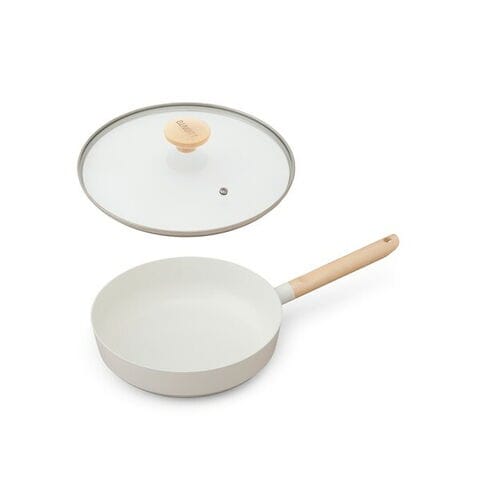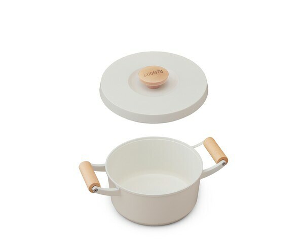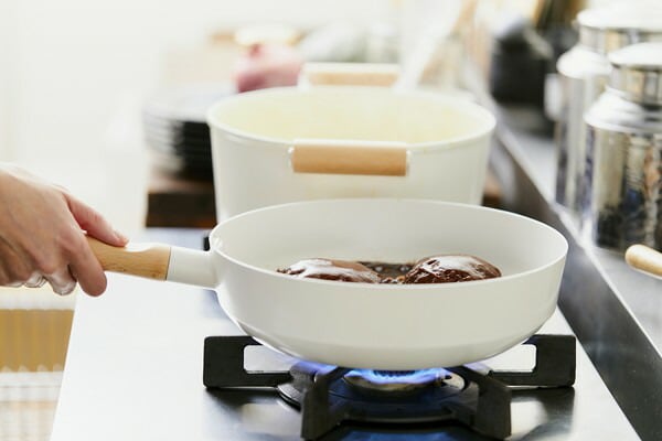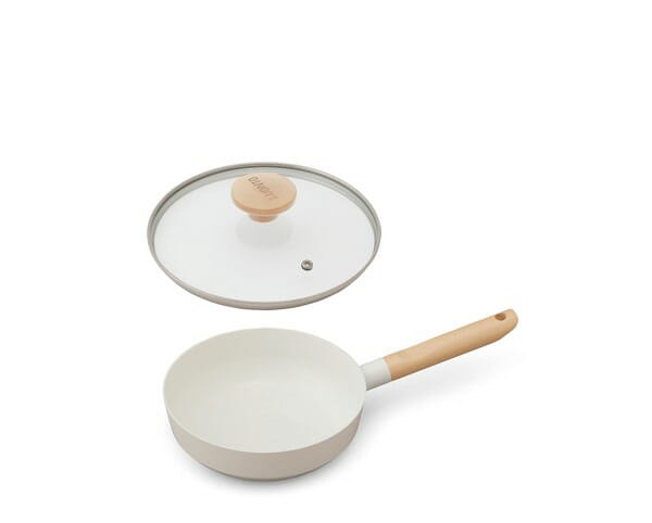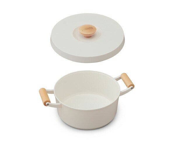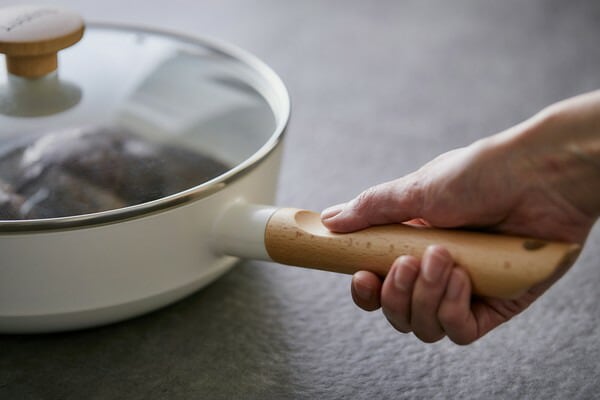 北欧をイメージしたデザインのフライパンと無加水鍋のセットです。セラミックコーティングでこびりつきにくく、汚れもスルっと落ちます。深型のフライパンは、炒め物や汁ものまで料理の幅が広がります。フライパンは底が厚いので変形しにくく、丈夫で長持ちします。無加水鍋は、素材のうまみを活かした料理が作れます。鍋とふたの間に蒸気の膜を作り、旨みを含んだ蒸気を逃がしにくい構造で、ふた裏の凸形状で蒸気を循環させます。天然木の取っ手やつまみを取り入れ、デザイン性をアップさせました。