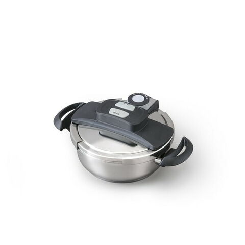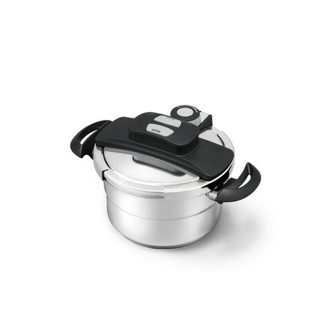 料理に応じて低圧・高圧の切り替えが簡単にできるダイアル式の両手圧力鍋3L・5Lのセットです。圧力の状態が一目でわかる圧力表示付きです。ふたはボタンを押すだけのワンタッチ開閉です。圧力調整装置で余分な蒸気を排出し、圧力を一定に保ちます。圧力がかかっているときはロックピンが上がり、ふたをロックします。また、鍋の圧力が完全に下がらないとふたが開かない安全設計です。鍋を2つ重ねて収納できます。