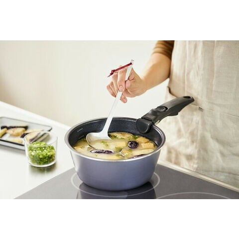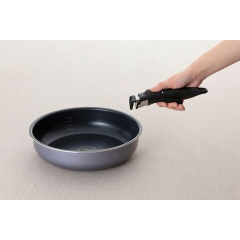 ダイヤモンドコーティングを使用した、こびりつきにくく丈夫で長持ちするフライパン・なべのセットです。ダイヤモンドコーティングとは、人工ダイヤモンドを細かい粒子状にしてふっ素樹脂コーティングに配合したものです。汚れがつきにくく、ハンドルをはずして丸洗いができ、お手入れも簡単です。日本の食文化に合わせフライパンを深型にしているので、煮物や汁物など幅広く使えます。フライパンとなべには便利な目盛り線が付いています。ハンドルの着脱は簡単で、握るだけで取り付けができ、ロック解除レバーを押すだけで外すことが出来ます。ガラスふたのつまみは伸縮するので使わない時は、コンパクトに収納できます。使用しないときは重ねて省スペースで収納できます。