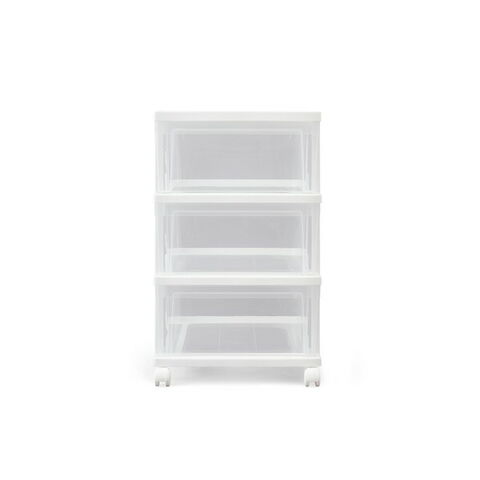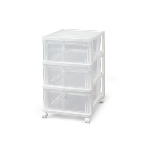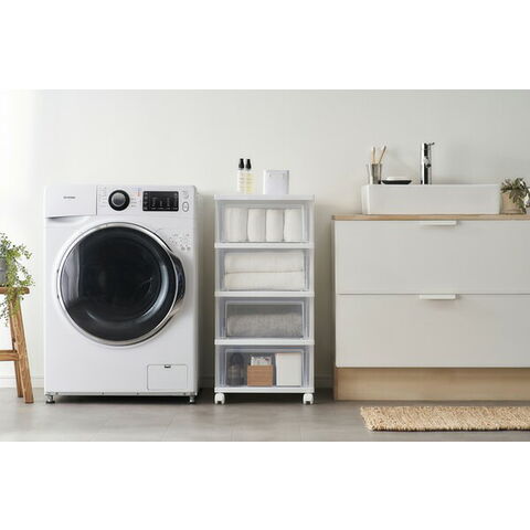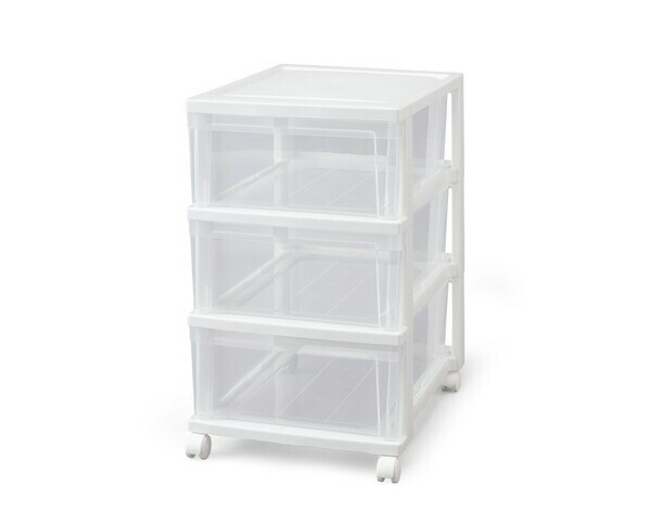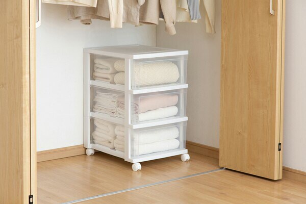 基本仕様 キャスターなしサイズ(約) 3段の場合:390×500×590mm 耐荷重(約) 3段の場合:全体14kg、天板2kg、引き出し1段あたり4kg 引出内寸(約) 318×450×162mm 収納の目安(引き出し1段あたり) バスタオルなら3枚、セーターなら3枚 組み替え可能段数 6段まで