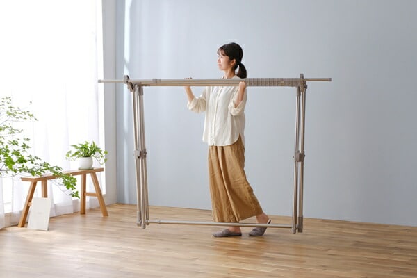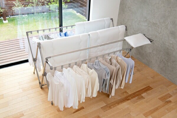 大量の洗濯物や最大6枚分の布団が干せる大容量タイプの布団干しです。 洗濯物の量に合わせてパイプを伸縮させて使用できます。 20個のハンガー掛け付きなので、間隔の調整が自由自在で洗濯物の片寄りも防げます。ダブルバー付きで、枕やぬいぐるみを干すこともできます。使用しない時は折りたたんで収納でき、ラクに持ち運べます。ステンレス巻きスチールパイプを採用しているので、丈夫でサビに強く長くお使いいただけます。工具不要で、組み立てが簡単です。