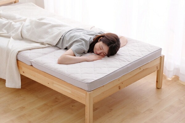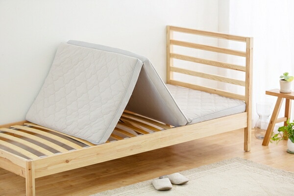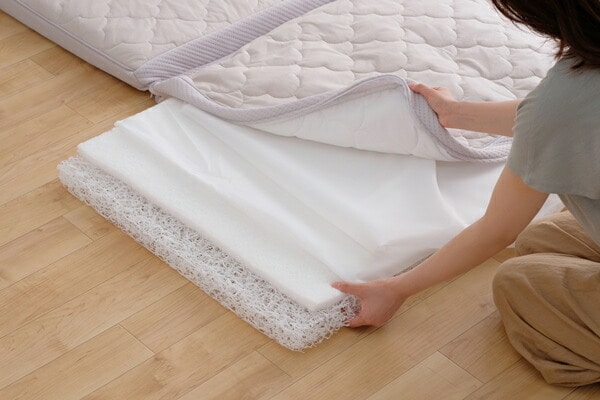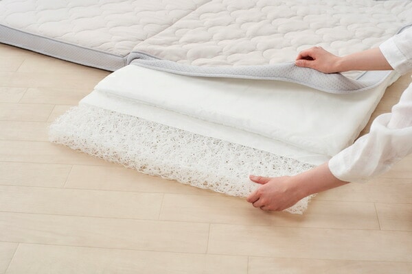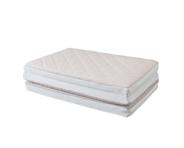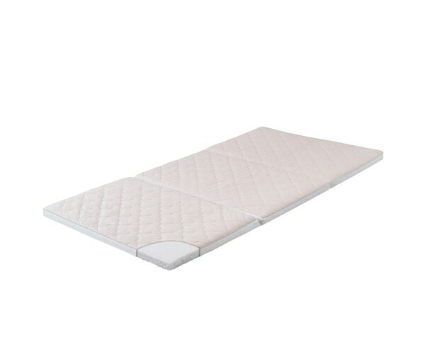 高い保湿性と保温性が特徴のエアリーマットレス Softeです。詰めもの上層部は約2cmの球形状粒わたをシート状に加工したマルーンシートです。軽くてやわらかい風合いはそのままに、片寄りにくく弾力性に優れています。詰めもの下層部は約4.8cmのエアロキューブを使用しています。高反発で身体を支え、体圧を分散します。湿気を逃し快適です。側生地は高い保湿性をもつリフレスを使用しています。セルロース系モイストファイバーで、しっとり、しなやかな風合いが魅力です。ふわふわした優しい肌触りのフェイクファーのボックスカバー付きです。コンパクトに収納できる三つ折りタイプです。
