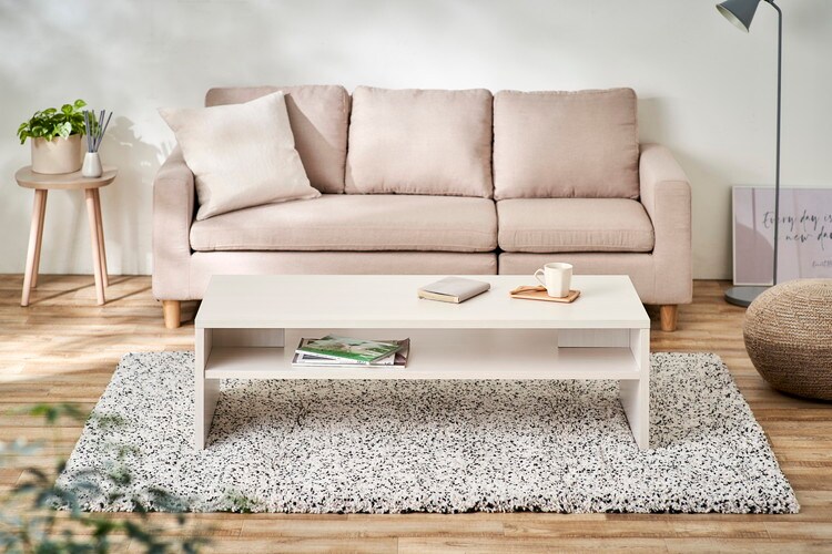 シンプルなデザインのリビングテーブルです。場所をとらないサイズ設計です。お部屋を開放的に演出します。天板の厚さは約2.3cmとしっかりとした作りです。メラミン樹脂加工で熱や水、汚れに強くお手入れが簡単です。フラットで使いやすい収納棚付きです。AVボードとしてもお使いいただけます。