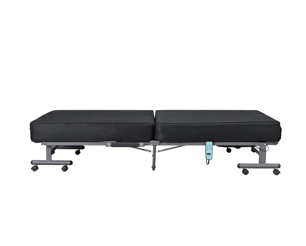 組立不要で、すぐに使える折りたたみ電動リクライニングベッドです。背もたれと脚部の2か所がリクライニングします。リモコンの『あがる』・『さがる』ボタンで簡単に操作ができ、お好みの角度でお使いいただけます。背もたれは無段階調節できます。脚部も背もたれに連動して高さ調節ができます。(背もたれまたは脚部のみの操作はできません)。マット部には体圧分散性に優れたポケットコイルを採用しています。コイルがポケットに包まれ独立しているので、複数の点で身体を支え、振動や横揺れが少なく、理想的な寝姿勢へ導きます。使いやすい高さ設計にこだわっています。マット部までの高さが約40cmと乗り降りしやすく、ベッド下の高さは約25cmで収納スペースとして有効活用できます。リモコンを使わないときはベッドサイドにかけて収納ができます。折りたたみ時や移動時に便利なサイドグリップ付きです。キャスター付きで、移動が楽に行えます。4か所ロック付きです。