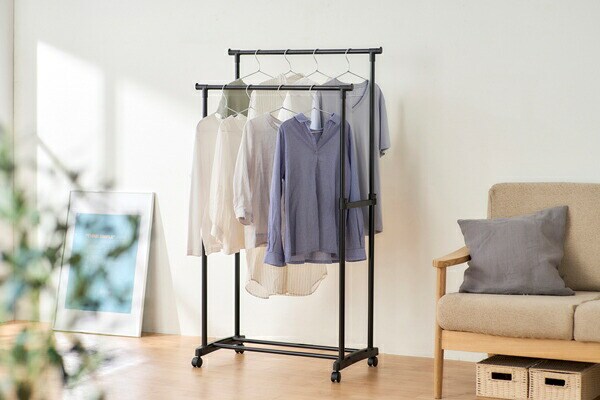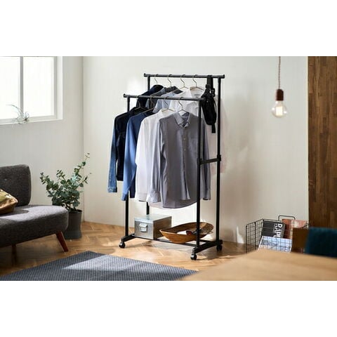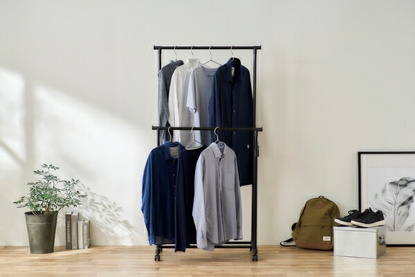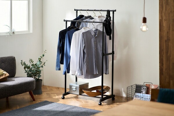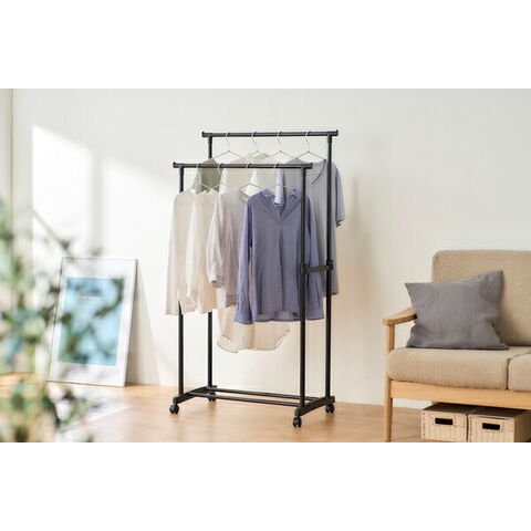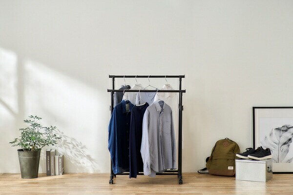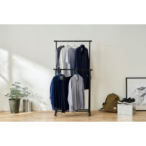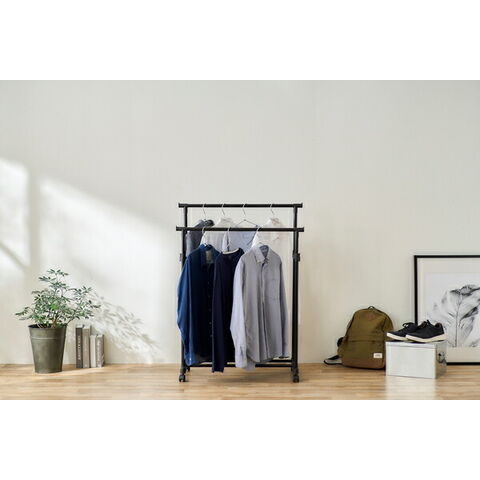 ブラック塗装仕上げでインテリアに馴染みやすいパイプハンガーです。安定感抜群で、たくさん掛けられます。ハンガーパイプの高さは約87.5~150cmの間で、無段階調整可能です。服の丈に合わせて、ストッパーをゆるめて伸縮させ、高さを固定できます。ハンガー下のスペースは収納物やボックスなどが置け、空間を有効活用できます。キャスター付きで移動がスムーズに行えます。ハンガーだけでなく、キャスターなどのパーツもすべてブラックで統一しています。お客様組み立てとなります。工具不要です。