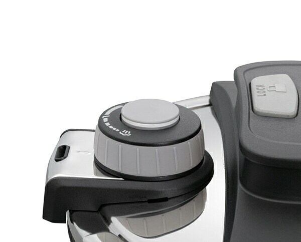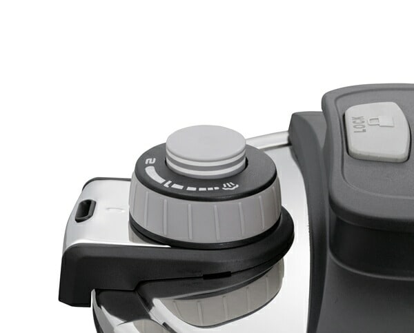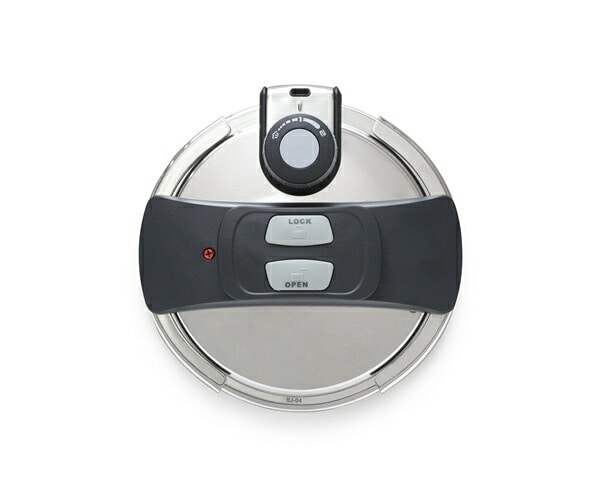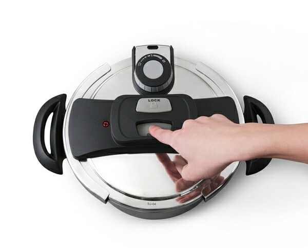 料理に応じて低圧・高圧の切り替えが簡単にできるダイアル式の両手圧力鍋です。圧力の状態が一目でわかる圧力表示付きです。ふたはボタンを押すだけのワンタッチ開閉です。圧力調整装置で余分な蒸気を排出し、圧力を一定に保ちます。圧力がかかっているときはロックピンが上がり、ふたをロックします。また、鍋の圧力が完全に下がらないとふたが開かない安全設計です。