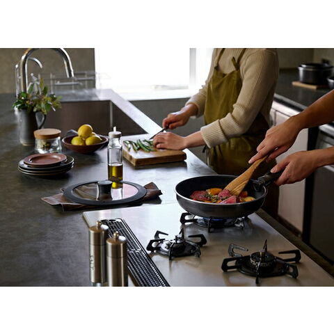 【フライパン・なべ・エッグパン】表面加工/内側:ふっ素樹脂塗膜加工、外側:焼付け塗装(底面を除く)、材質/本体:アルミニウム合金(はり底含む底の厚さ4.5mm)、はり底:ステンレス鋼(クロム16%) 【ガラスふた】ふた本体:強化ガラス(全面物理強化)、ゴム部:シリコーン 【PEシールふた】原料樹脂:ポリエチレン、耐熱温度(約):80℃ 【マルチハンドル】樹脂部:フェノール樹脂、ナイロン、金属部:ステンレス鋼(クロム18%、ニッケル8%)、ゴム部:シリコーン