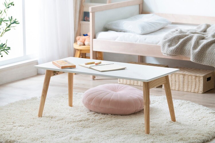 組み立て不要で、すぐに使える折り畳みセンターテーブルです。天板は斜め加工のエッジを活かしたデザインです。清潔感のあるホワイトの天板とやわらかな木目の脚がかわいいバイカラーです。天板には熱、水、傷に強いメラミン樹脂を使用しています。脚はラッカー塗装が施されており柔らかい光沢があります。天板下が広いので、足を伸ばしてくつろげます。脚が折りたたみ可能で、使わない時はコンパクトに収納できます。ワンタッチレバーで簡単に折りたためます。