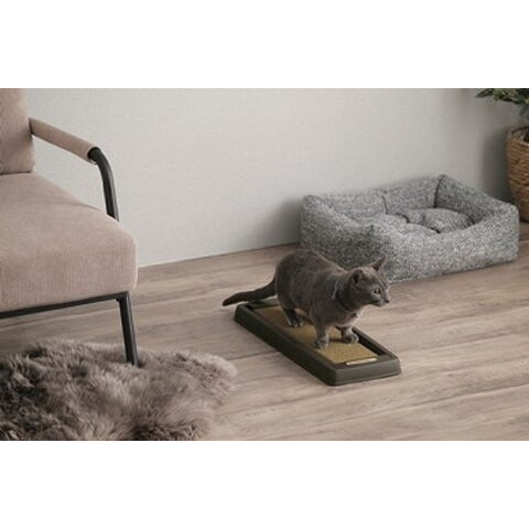 猫がのびのび爪とぎできる、置き場所をとらないスリムタイプの爪とぎです。片端をツメ付きバックルで押さえるだけで簡単に固定でき爪とぎのズレを防ぎます。セットの爪とぎは目が大きいので爪が研ぎやすく、爪とぎを裏返して両面使用できます。研ぎくずが飛び散りにくくゴミが出にくいダストレスです。ゴミの量を約40%カットできます(当社比)。インテリアに馴染む枠カラーです。マタタビシール付きです。
