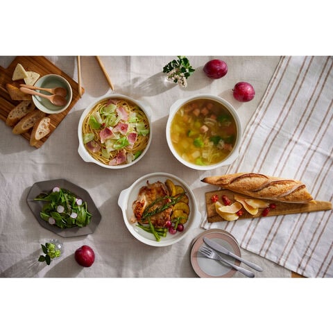 料理を作ってそのままテーブルへ、お皿になるフライパンセットです。コンパクトな1人暮らし向けです。カラーと見た目にこだわり食卓へ馴染むかわいらしいデザインです。お皿としてもフライパンとしても使いやすい形状です。安全性に優れるセラミックコーティングを使用しています。保存時に便利なPEシールふた付きで、冷蔵庫へそのまま保存できます。フライパンとお皿が1つのため食後の洗い物が少なくて済みます。使用しないときは重ねて省スペースで収納できます。ハンドルはおしゃれな木目調です。調理の際は必ず油をひき、中火以下で使用してください。