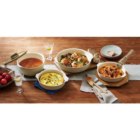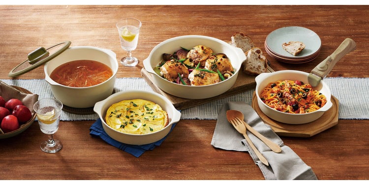料理を作ってそのままテーブルへ、お皿になるフライパンセットです。使いやすい1~2人向けです。カラーと見た目にこだわり食卓へ馴染むかわいらしいデザインです。お皿としてもフライパンとしても使いやすい形状です。安全性に優れるセラミックコーティングを使用しています。保存時に便利なPEシールふた付きで、冷蔵庫へそのまま保存できます。フライパンとお皿が1つのため食後の洗い物が少なくて済みます。使用しないときは重ねて省スペースで収納できます。ハンドルはおしゃれな木目調です。調理の際は必ず油をひき、中火以下で使用してください。