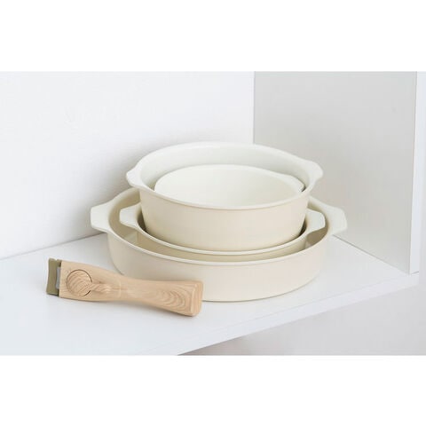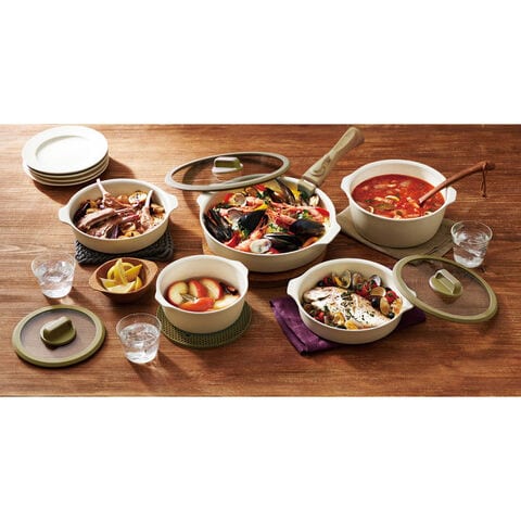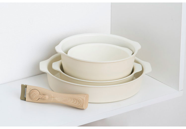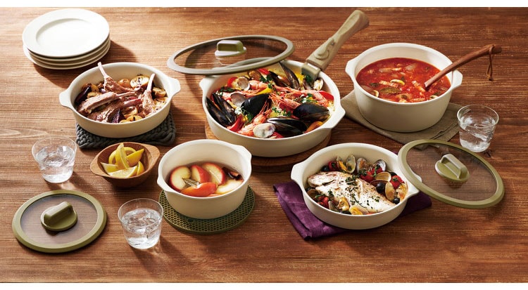 料理を作ってそのままテーブルへ、お皿になるフライパンセットです。1~2人向けで料理を楽しみたい方におすすめです。カラーと見た目にこだわり食卓へ馴染むかわいらしいデザインです。お皿としてもフライパンとしても使いやすい形状です。安全性に優れるセラミックコーティングを使用しています。保存時に便利なPEシールふた付きで、冷蔵庫へそのまま保存できます。フライパンとお皿が1つのため食後の洗い物が少なくて済みます。使用しないときは重ねて省スペースで収納できます。ハンドルはおしゃれな木目調です。調理の際は必ず油をひき、中火以下で使用してください。