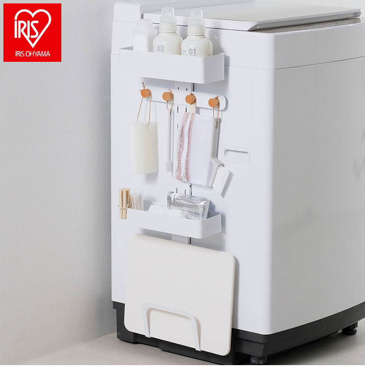 洗濯機周りの小物を収納できるランドリーマルチラックです。マグネット仕様で洗濯機の側面に簡単に取り付けられます。デッドスペースになりがちな洗濯機周りを収納スペースに変えられます。ボックスは洗剤や柔軟剤、フックは洗濯ネットや掃除用具、スタンドは体重計や珪藻土マットなどが収納できます。ボックス、木製フック、スタンドはお好みの高さに組み替えが可能です。木とスチールの組み合わせで上質なデザインです。滑り止めシリコンシートにより重さによるズレを防止します。お客様組み立てとなります。