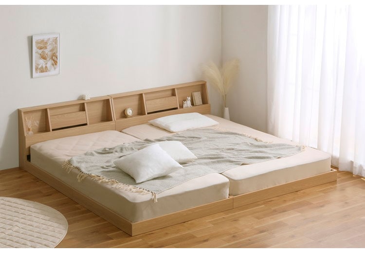 床板が低く、お部屋に開放感を生み出すフロアベッドです。くつろぎ空間を演出します。マットレスのズレを防ぐ落とし込みタイプです。フレーム内にマットレスが収まります。床までの距離が近く、ベッドから転落しても衝撃が緩和できます。小さなお子さまがいるご家庭でも安心してお使いいただけます。ヘッドボードは魅せる収納・隠す収納、どちらも揃っています。扉を閉めるとブックスタンド、タブレットやスマホスタンドになります。扉内は2口コンセント付きで便利です。オープンスペースは小物を置いてベッド周りを使いやすくできます。床板はすのこ仕様で通気性がよく湿気が溜まりにくく、オールシーズン快適です。お客様組み立てとなります。