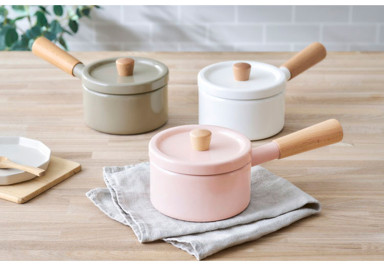 直径14cmと使いやすいコンパクトなサイズで、かわいらしいカラーとデザインのミルクパンです。ミルクや飲み物を温めるのはもちろん、少量の調理や離乳食作りに便利です。セラミックコーティング加工により、こびりつきにくく、汚れもスルっと落ちます。ハンドルとつまみは天然木を採用し、熱を伝えにくくなっています。注ぎ口が付いている為、液体などを注ぎやすい形状となっています。ガス火・IHに対応しています。