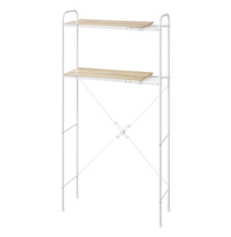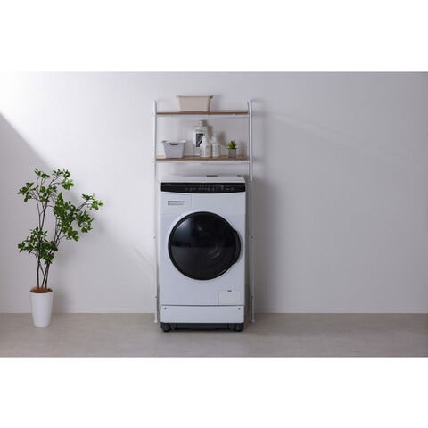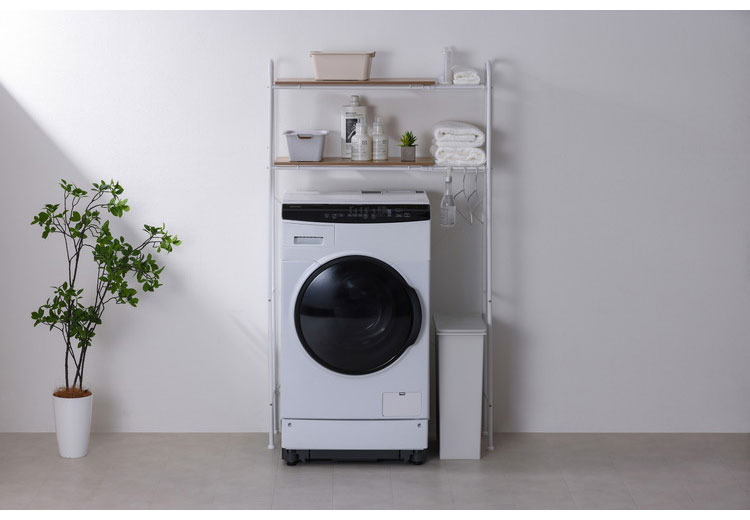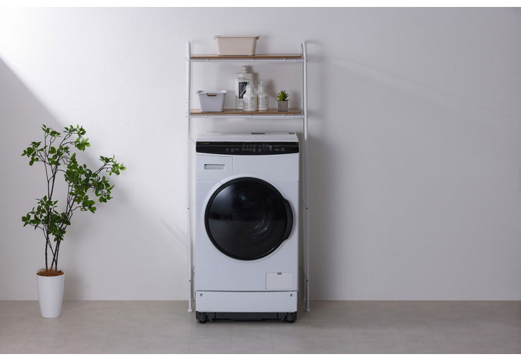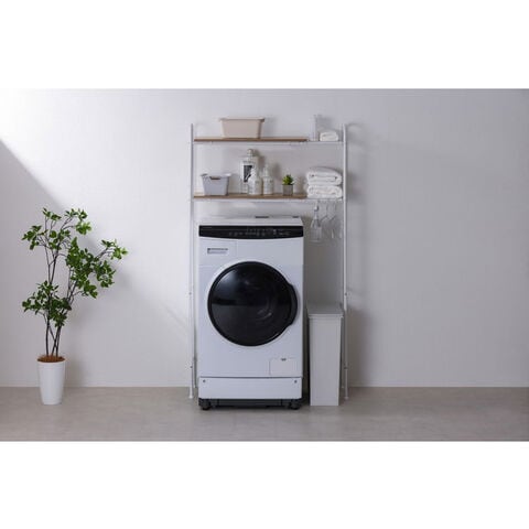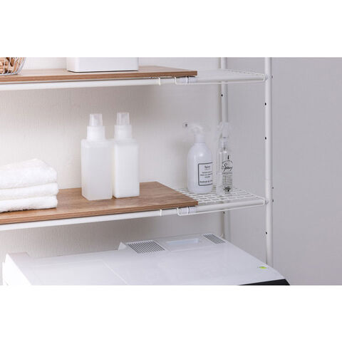 シンプルなデザインのスタイルランドリーラックです。設置場所に合わせてサイズ調節ができる幅伸縮タイプです。インテリアに馴染む木目調の棚板は、ランドリー周りをおしゃれに収納できます。約9cm間隔で6段階、収納物に合わせて高さ調整が可能です。棚板とワイヤーラックの組合せにより、伸長して使用した場合でも物が置けます。脚部アジャスターにより、がたつきを防止しています。付属している大きい脚部アジャスターを使用することで、防水パンが壁面に近いご家庭でも設置できます。お客様組み立てとなります。