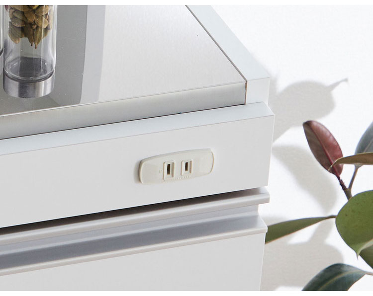 中天板には水や熱に強いステンレス鋼を使用。前面にはツヤあり、水や汚れに強いポリエステル化粧板を使用、本体には特殊コートを施しており、しつこい汚れなどサッと拭き取れます。引出しは1~3段目にはカトラリーなど小物の収納に便利です。最下段はスライドレール付きで重い物をいれても楽に引き出せて便利です。上部の扉は、組立時に左右どちら開きにも設定できます。