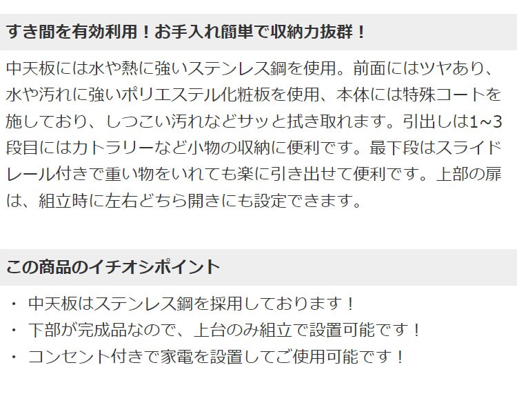 中天板には水や熱に強いステンレス鋼を使用。前面にはツヤあり、水や汚れに強いポリエステル化粧板を使用、本体には特殊コートを施しており、しつこい汚れなどサッと拭き取れます。引出しは1~3段目にはカトラリーなど小物の収納に便利です。最下段はスライドレール付きで重い物をいれても楽に引き出せて便利です。上部の扉は、組立時に左右どちら開きにも設定できます。