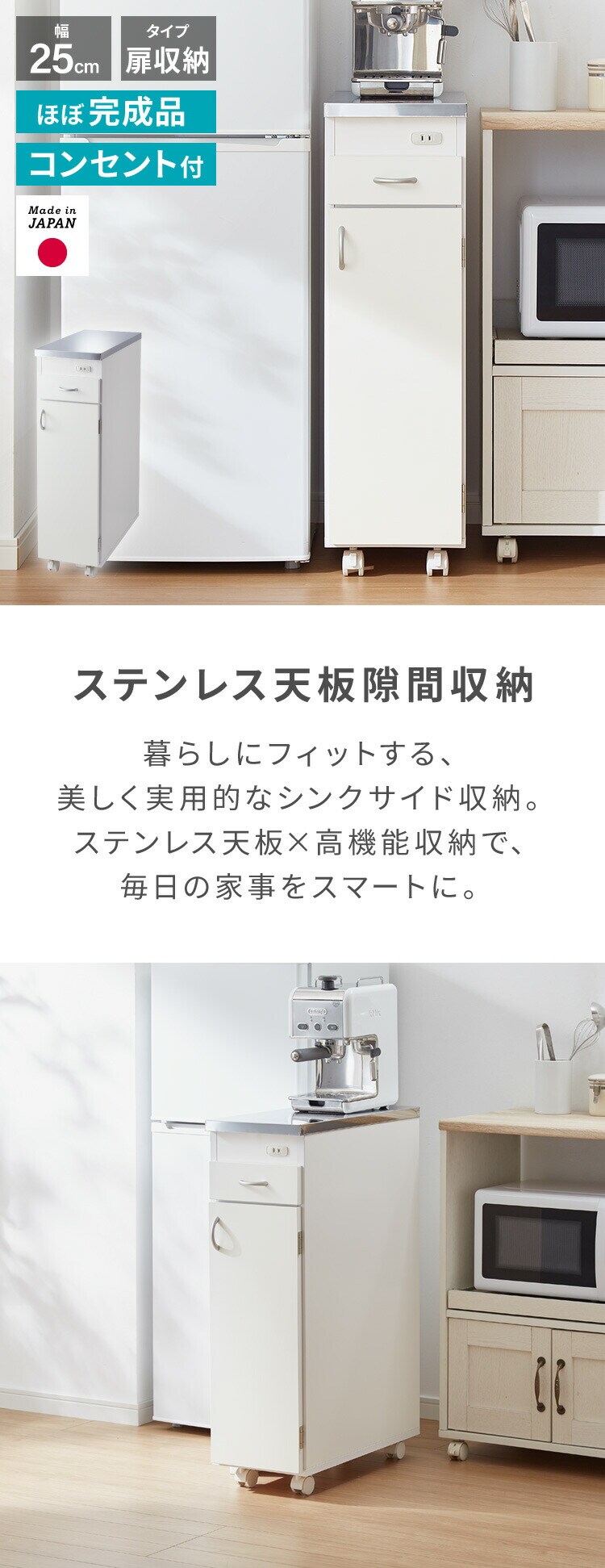 日本製 ステンレス天板 キッチン収納 幅25cm キャスター付き 扉付き シンク横ラック コンセント付き スリム収納 隙間活用 スリムラック キッチンストッカー 省スペース 省スペース 隙間収納【送料無料】