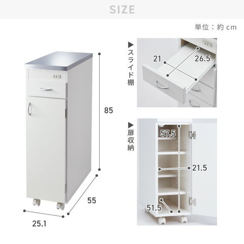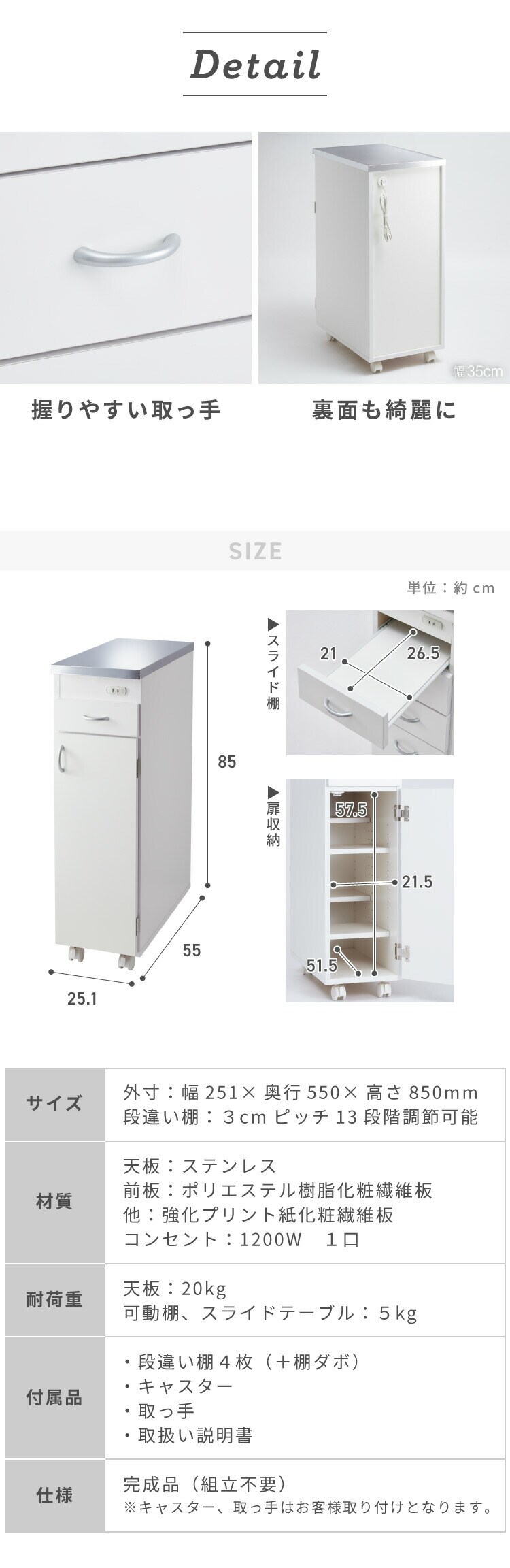 日本製 ステンレス天板 キッチン収納 幅25cm キャスター付き 扉付き シンク横ラック コンセント付き スリム収納 隙間活用 スリムラック キッチンストッカー 省スペース 省スペース 隙間収納【送料無料】のレビュー