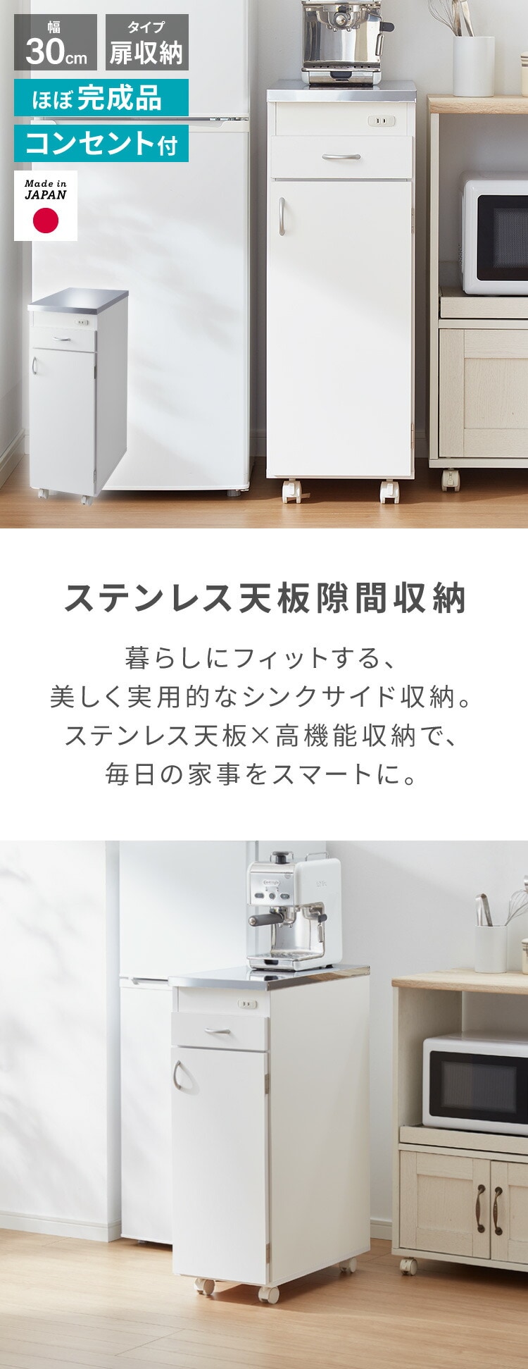 日本製 ステンレス天板 キッチン収納 幅30cm キャスター付き 扉タイプ シンク横キャビネット コンセント付き スリム設計 スリムラック キッチンストッカー 省スペース シンク横ラック 隙間収納【送料無料】