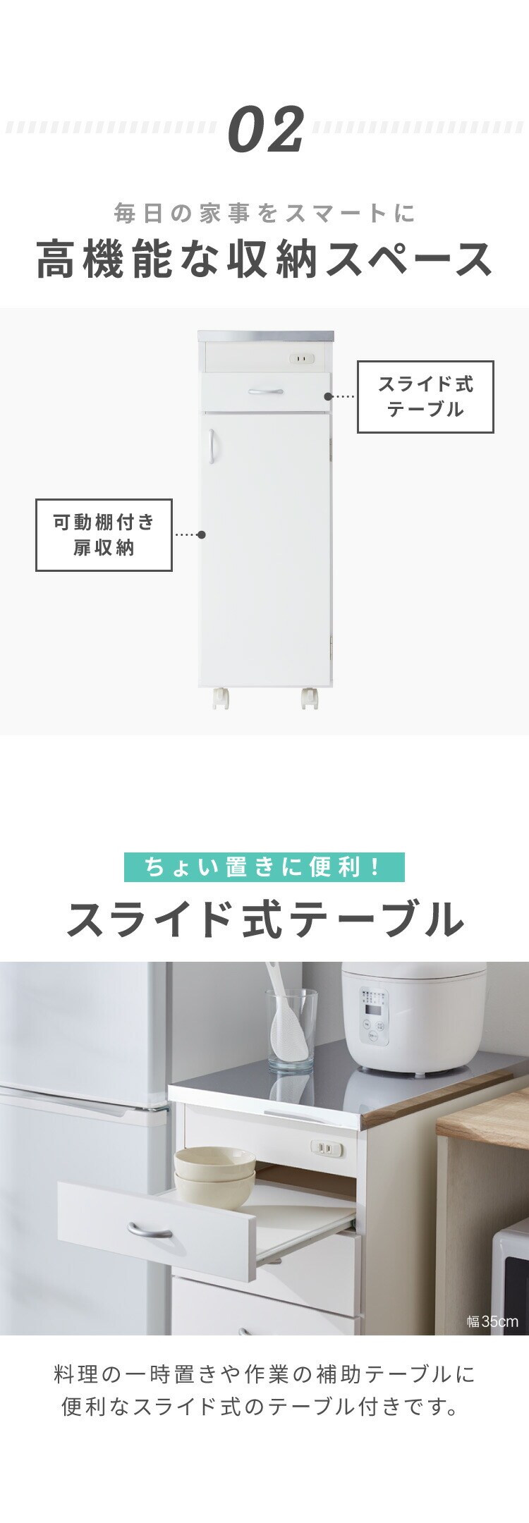 幅は20cm・25cm・30cm・35cmの4サイズ展開で、キッチンのスペースにぴったりフィット