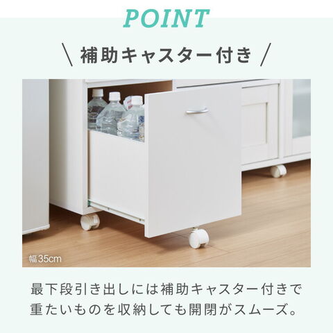 下段引き出しにはスライドレール+キャスター付きで、重たいものもスムーズに出し入れ可能