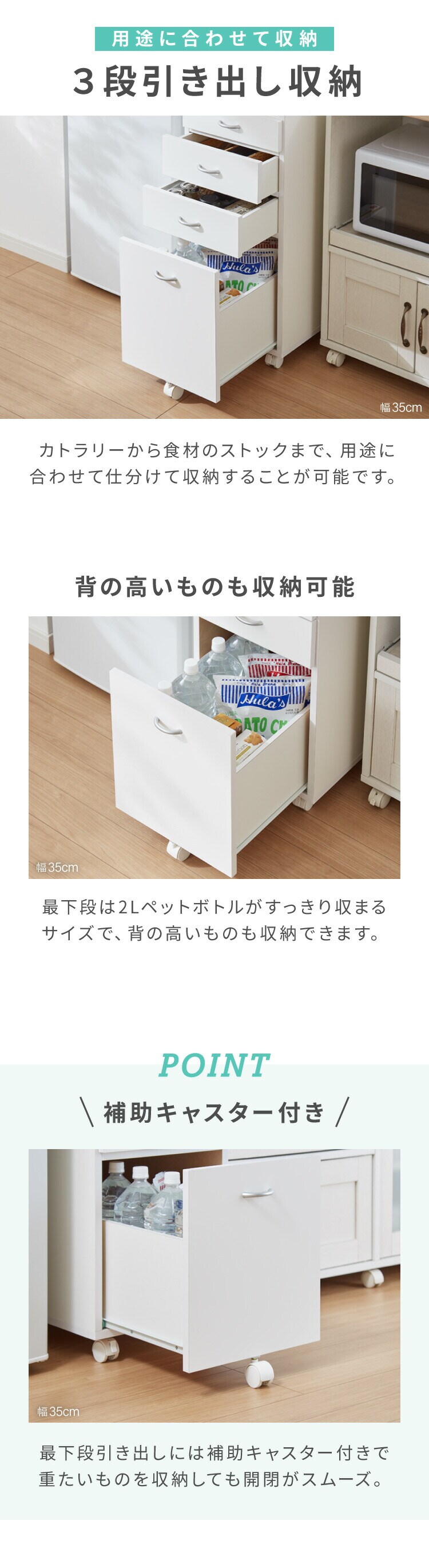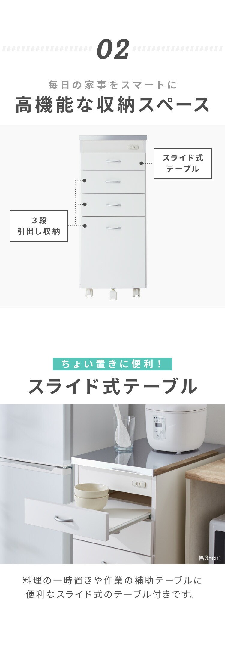 幅は20cm・25cm・30cm・35cmの4サイズ展開で、キッチンのスペースにぴったりフィット