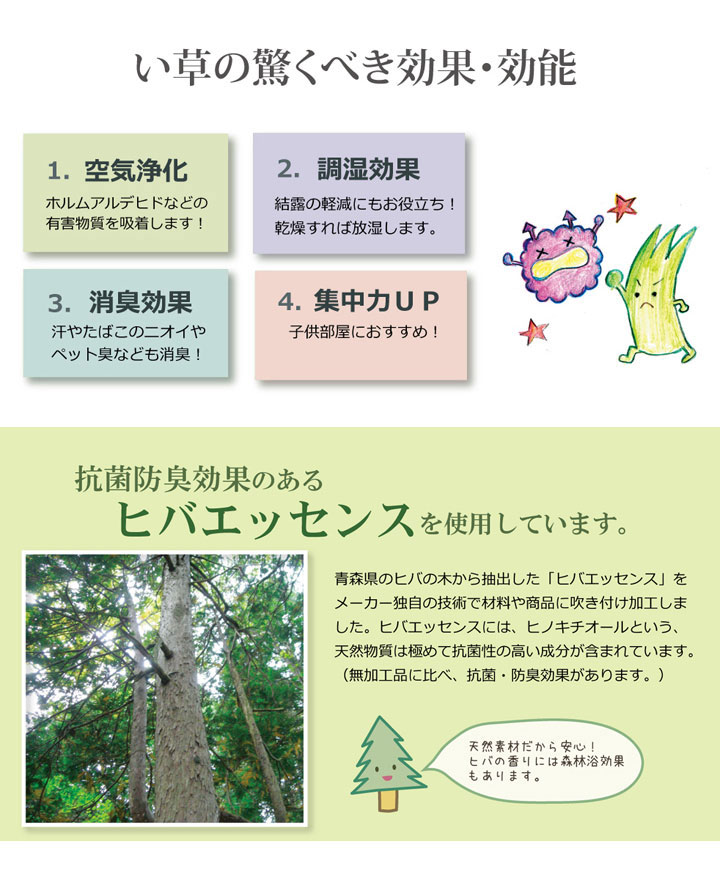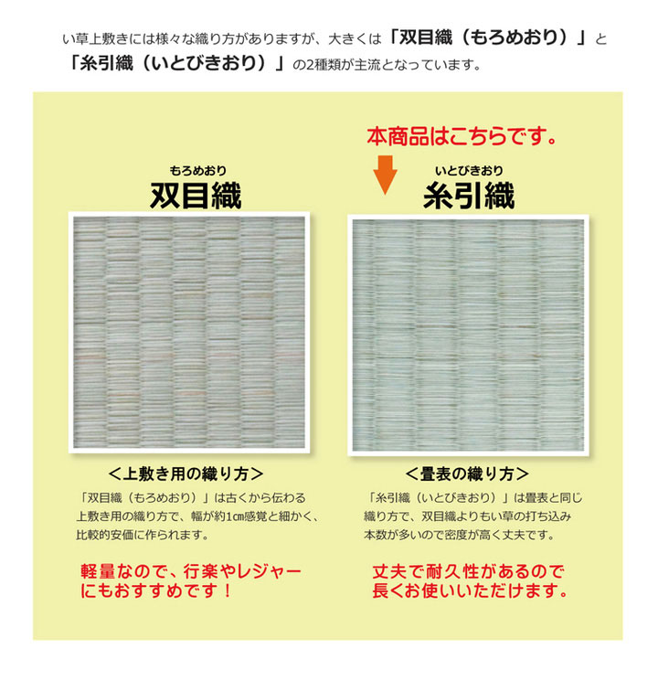 日焼けしてしまった畳のリフレッシュに、新品の畳を汚さないためのカバーにご使用下さい。長さ110~115cm程の国産(九州産)い草を使用しています。そのうち約95cmを使用しています。ヘリ際は強く白みを帯びます。(日焼けではありません、い草の根元と先端部分の色です。い草は先端部分が赤茶色く、根元が白く真中が青(緑)色です。真中の良質な青の部分を多く使用するほど、丈夫で綺麗な仕上がりとなります。またイ草は使用するうちに日焼けをしますが、真中の青の部分を多く使用した物ほど全体が綺麗に日焼けし、味が出ます。こちらの商品は畳表と同じ織り方の糸引織で仕上げました。双目織りと比べて、い草の打ち込み本数が多いため丈夫です。表面が滑らかなので、ホコリなどがたまりにくいのが特徴です。国産(九州産)のい草を使用しています。
