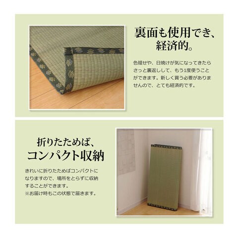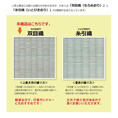 上敷きを敷くだけで畳のお部屋をリフレッシュ出来ます。日焼けしてしまった畳のリフレッシュに、新品の畳を汚さないためのカバーにご使用下さい。長さ105~110cmの国産(九州産)い草を使用しています。そのうち約85cmを使用しています。ヘリ際はある程度白みを帯びます。(日焼けではありません、い草の根元と先端部分の色です。)い草は先端部分が赤茶色く、根元が白く真中が青(緑)色です。真中の良質な青の部分を多く使用するほど、丈夫で綺麗な仕上がりとなります。またイ草は使用するうちに日焼けをしますが、真中の青の部分を多く使用した物ほど全体が綺麗に日焼けし、味が出ます。国産(九州産)のい草を使用しています。