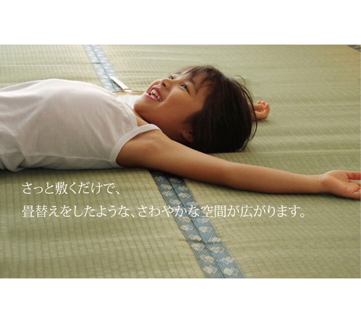 上敷きを敷くだけで畳のお部屋をリフレッシュ出来ます。日焼けしてしまった畳のリフレッシュに、新品の畳を汚さないためのカバーにご使用下さい。長さ105~110cmの国産(九州産)い草を使用しています。そのうち約85cmを使用しています。ヘリ際はある程度白みを帯びます。(日焼けではありません、い草の根元と先端部分の色です。)い草は先端部分が赤茶色く、根元が白く真中が青(緑)色です。真中の良質な青の部分を多く使用するほど、丈夫で綺麗な仕上がりとなります。またイ草は使用するうちに日焼けをしますが、真中の青の部分を多く使用した物ほど全体が綺麗に日焼けし、味が出ます。国産(九州産)のい草を使用しています。